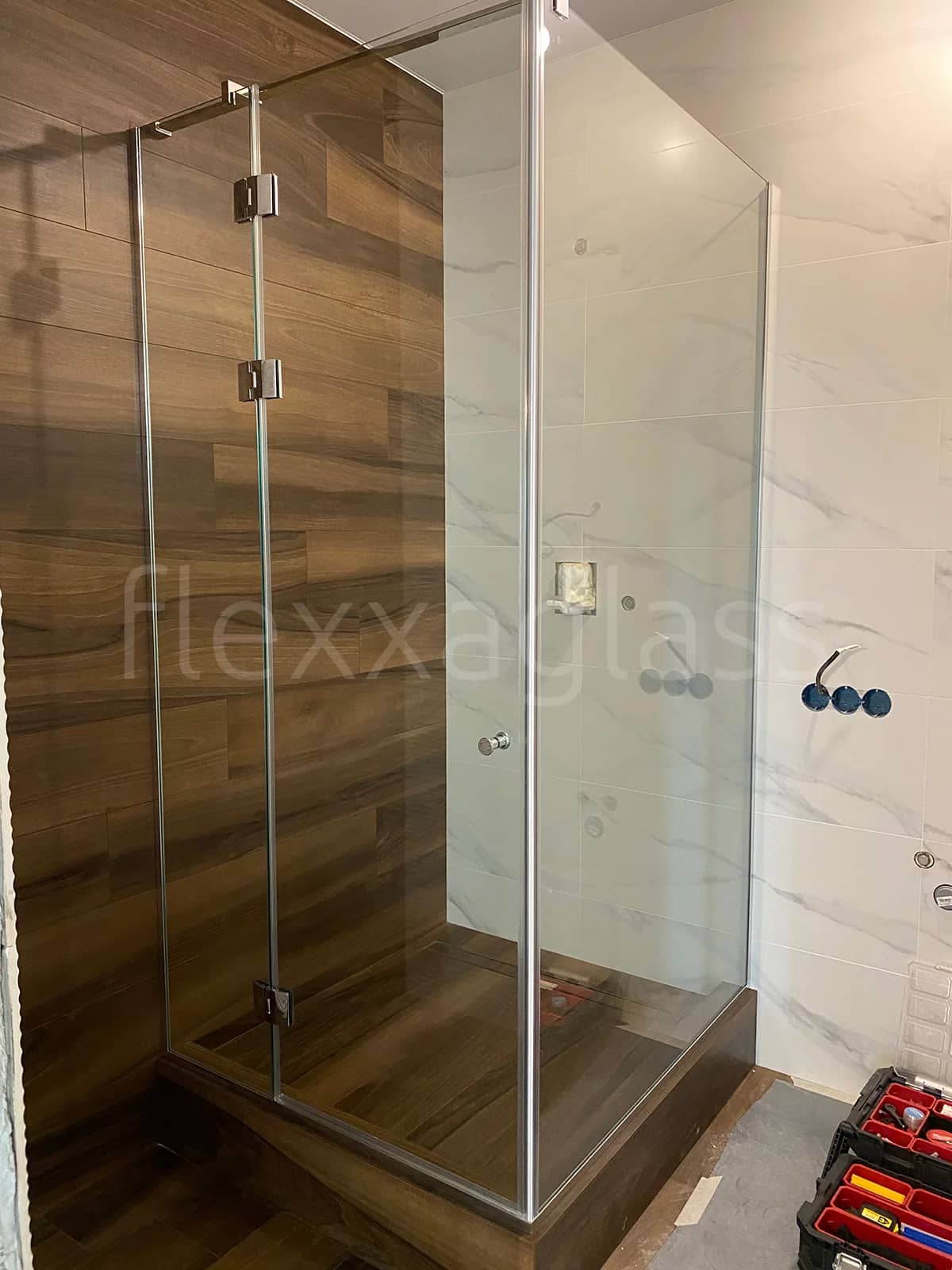 Угловая душевая с двумя распашными дверьми